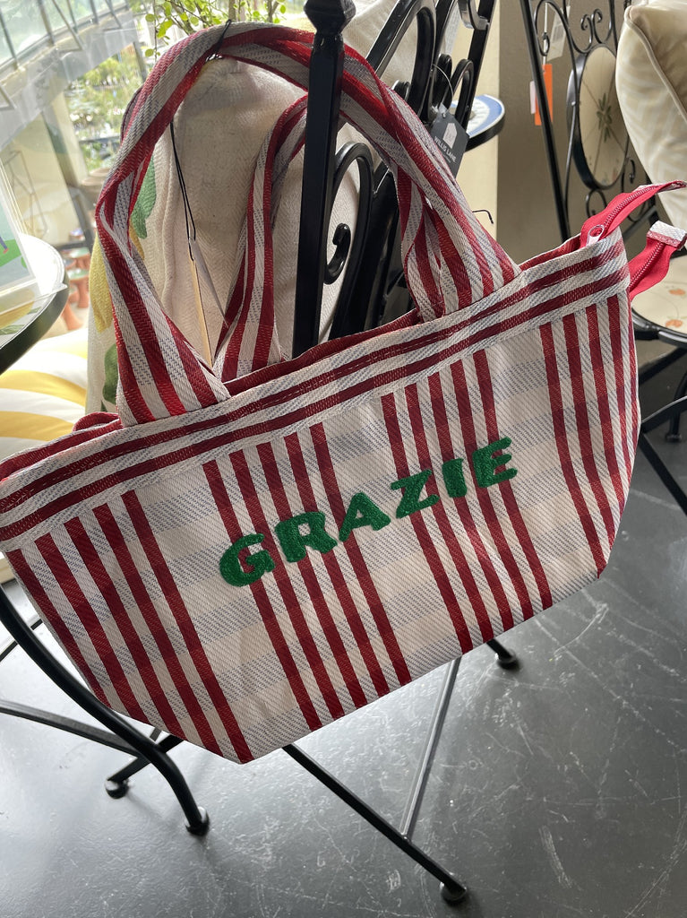 Cleverly crafted in India from recycled plastic bags.  This durable material is perfect for groceries, travel, beach trips and every day use.